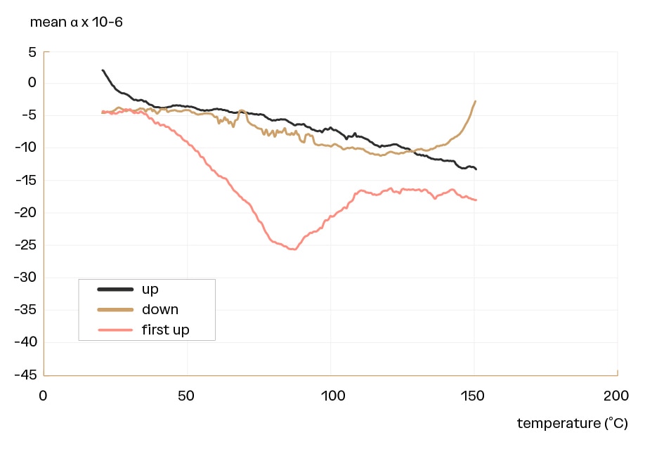 Figure 8: The actual thermal expansion coefficient of Twaron 1000 yarn as function of the temperature, for the scans up (average value of three scans), the scans down (average value of four scans) and the first scan up, respectively.